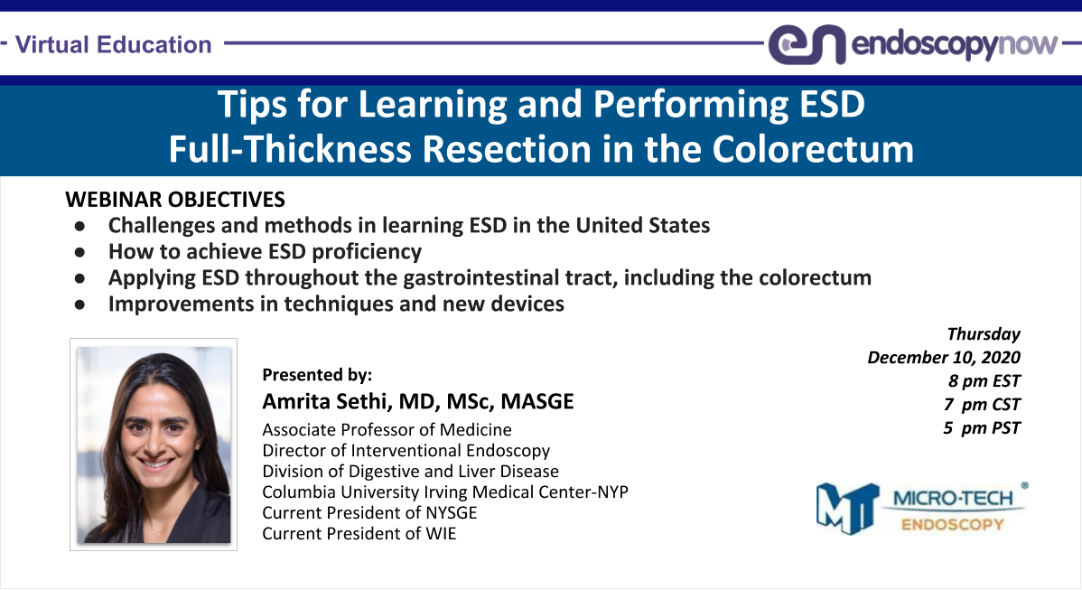 Amrita Sethi, MD, MSc, MASGE will present tips on performing ESD full-thickness resection in the colorectum.